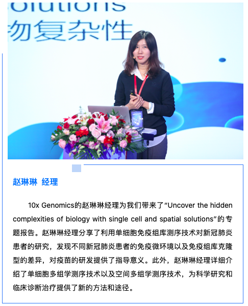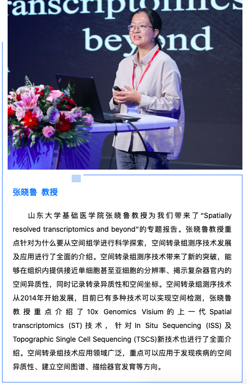 清華大學醫(yī)學院研究員、博士生導(dǎo)師,生物芯片北京國家工程研究中心常務(wù)副主任,博奧生物集團有限公司高級副總裁,北京博奧晶典生物技術(shù)有限公司總裁邢婉麗女士為本次會議進行了開幕式致辭。邢婉麗總裁表示單細胞測序技術(shù)及空間轉(zhuǎn)錄組技術(shù)在生命科學和醫(yī)學研究領(lǐng)域的應(yīng)用日益受到關(guān)注,為高分辨率研究細胞分群和組織功能研究提供重要的支撐,對發(fā)現(xiàn)組學間關(guān)系、記錄動態(tài)生物活動具有非常重要的意義,為科學界和醫(yī)學界更加深入地去認識生命的本質(zhì),解析胚胎發(fā)育過程、腫瘤發(fā)生發(fā)展、新冠肺炎免疫機制、發(fā)現(xiàn)新的生物標志物和治療靶點等提供全新而絢爛的研究視角。邢婉麗總裁對所有報告嘉賓及參會嘉賓的到來表示熱烈歡迎及衷心感謝!