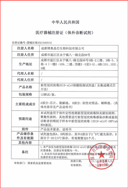2021年2月10日,恰逢新春佳節(jié)來臨之際,依托國家科技部應(yīng)急攻關(guān)項目,博奧聯(lián)合清華大學(xué)成功研發(fā)的由新型冠狀病毒2019-nCoV核酸檢測試劑盒(全集成碟式芯片法)(國械注準(zhǔn):20213400101)和全自動核酸分析儀(國械注準(zhǔn):20213220102)組成的全集成芯片實驗室獲國家藥監(jiān)局應(yīng)急審批批準(zhǔn),為全國新冠肺炎疫情防控提供現(xiàn)場快速檢測“芯”利器。