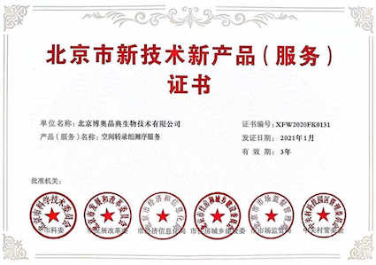博奧晶典空間轉(zhuǎn)錄組測序服務(wù)喜獲北京市新技術(shù)新產(chǎn)品(服務(wù))證書