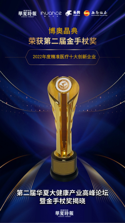 歲末年初,博奧晶典憑借在精準醫(yī)療領(lǐng)域的多項核心專利技術(shù)和高質(zhì)量創(chuàng)新產(chǎn)品,在近日由華夏時報社、蘭州新區(qū)管委會等單位共同主辦的第二屆華夏大健康產(chǎn)業(yè)高峰論壇暨金手杖獎頒獎盛典上喜獲“2022年度精準醫(yī)療十大創(chuàng)新企業(yè)”。此次獲得2022年度精準醫(yī)療十大創(chuàng)新企業(yè),是對博奧晶典科技創(chuàng)新能力的充分肯定,亦是對博奧晶典行業(yè)龍頭地位的高度認可。