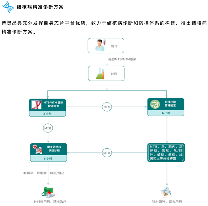 結(jié)核病精準(zhǔn)診斷方案中包含:分枝桿菌核酸檢測試劑盒(PCR-熒光探針法)、分枝桿菌菌種鑒定試劑盒(DNA微陣列芯片法)、結(jié)核分枝桿菌耐藥基因檢測試劑盒(DNA微陣列芯片法)。這三款診斷產(chǎn)品,環(huán)環(huán)相扣,涵蓋了結(jié)核快速篩查、菌種鑒定、耐多藥結(jié)核病快速診斷,構(gòu)成了晶芯®結(jié)核病快速分子診斷系統(tǒng)。結(jié)核診斷、輔助用藥全面覆蓋,真正實現(xiàn)結(jié)核全程分子監(jiān)控。