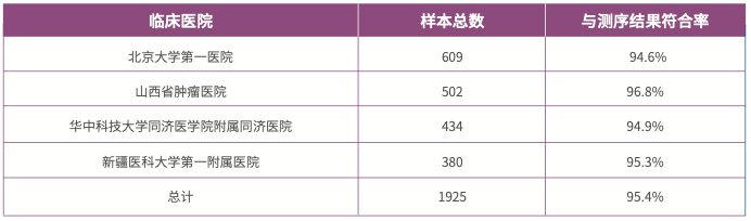1925 例來自北京大學(xué)第一醫(yī)院、山西省腫瘤醫(yī)院等醫(yī)療機構(gòu)的臨床樣本使用 HPV 檢測試劑盒檢測結(jié)果表明:對于 HPV 感染陽性的樣本,芯片檢測結(jié)果與 DNA 測序結(jié)果比較,符合率在 95% 以上。
